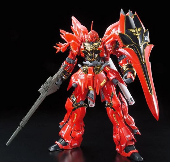 The crimson Mobile Suit Sinanju, piloted by the leader of the Sleeves, Full Frontal, has finally launched in the RG line-up! The model includes movable rear-mounted thrusters, which are based on the thrust control mechanisms of real rocket engines and internal skeletal detailed from drawings by Hajime Katoki. The texture of the brilliant gold engravings have been faithfully recreated as individual parts while the its main body is made in a glossy red plastic. Set includes a beam rifle, beam saber, beam axe, shield, beam effect parts, and interchangable hands.