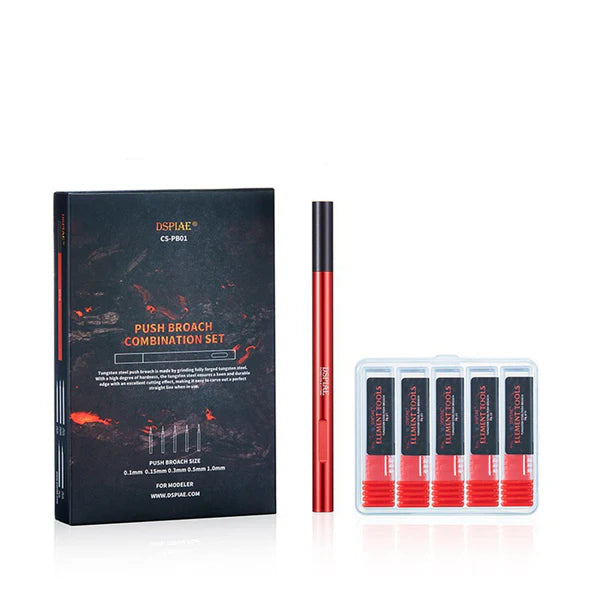 The DSPIAE CS-PB01 Push Broach Combination Set is a precision hand-tool kit designed for professional modelers and craftspeople who need fine control over panel lining, engraving, and surface detailing. This premium set includes five ultra-sharp push broaches in the following sizes: 0.1 mm, 0.15 mm, 0.3 mm, 0.5 mm, and 1.0 mm, allowing for highly accurate and consistent cuts across different applications.