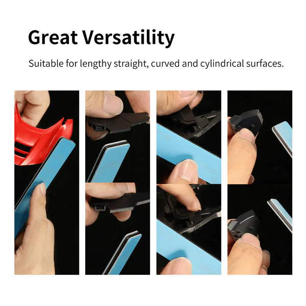 Suitable for plastic, resin, and even metal-detail parts (with care) thanks to the durable backing and effective abrasive layer