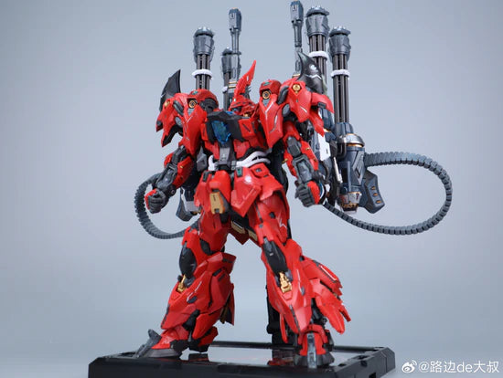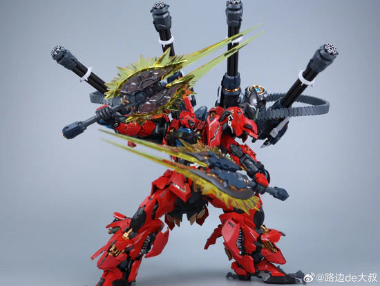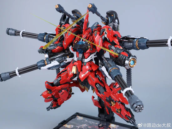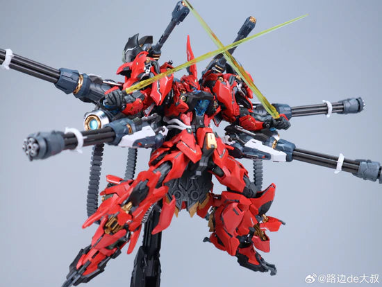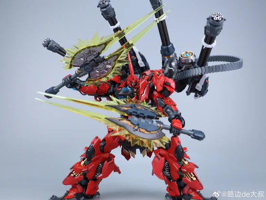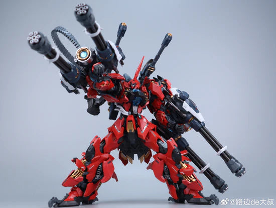 This model is equipped with four heavy Gatling guns, a beam axe, thermal axe, beam dagger, and a beam long sword for dynamic posing options and formidable combat display. The model’s precision-engineered skeleton enhances its mechanical appeal. With exposing armor that showcases the skeletal structure even when assembled, this kit is as functional as it is visually striking.