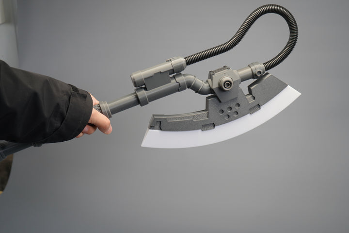 Realistic Details: Rugged mechanical design with flexible tubing and weathered blade effect for a battle-worn look.